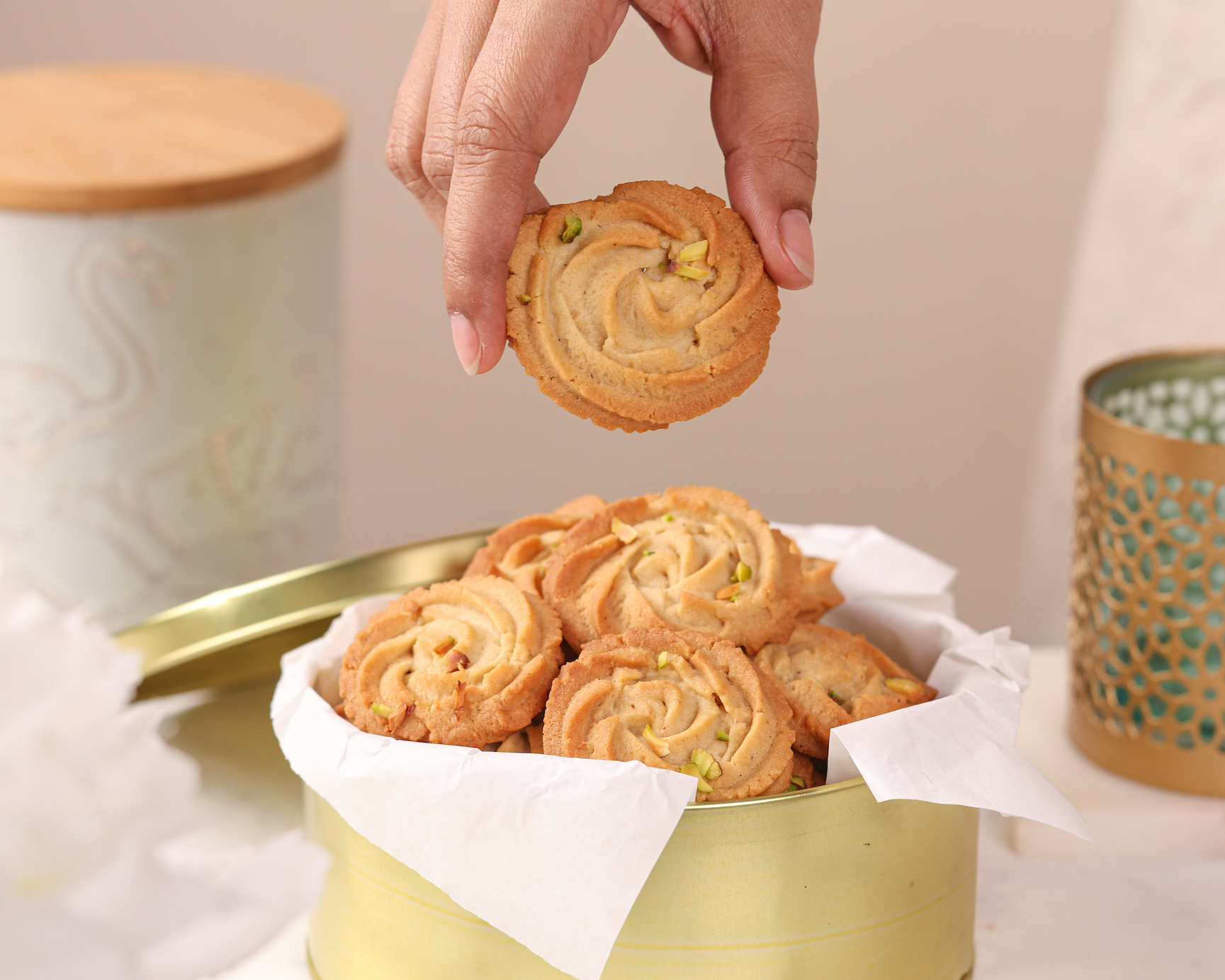 1/3 cup (80g) - Butter 1/4 cup (50g) - Powdered Raw Sugar 1/4 tsp - Salt 2.5 tbsp (30g)- Fresh Cream 2/3 cup (90g) - Wholewheat Flour 2 tbsp (15g) - Corn Flour 1/4 cup (30g) - Sunflower Seeds Few strands Saffron 1 tsp - Chopped Pistachio Grind the dry mix – In a blender, grind wholewheat flour along with sunflower seeds (or almonds/cashews), cardamom pods, and saffron into a fine flour. Cream butter and sugar – In a mixing bowl, whisk room-temperature butter and powdered raw sugar until light and creamy. Add cream – Whisk in the cream to make the mixture smooth and fluffy. Use an electric whisk to make the work easier. Combine wet and dry – Gradually add the ground flour mixture into the butter mixture. If the dough feels too stiff, add 1–2 teaspoons of milk to adjust the consistency. Pipe the cookies – Transfer the dough into a piping bag fitted with a star nozzle. Pipe flower shapes onto a parchment-lined baking tray. Add pistachios & chill – Sprinkle chopped pistachios on top. Refrigerate the tray for 15–30 minutes so the cookies hold their shape while baking. Bake – Preheat the oven to 180°C. Bake the cookies for 15–20 minutes, until the edges turn lightly golden. Cool & serve – Let the cookies cool on a wire rack completely. Store them in an airtight container for upto 3 weeks.