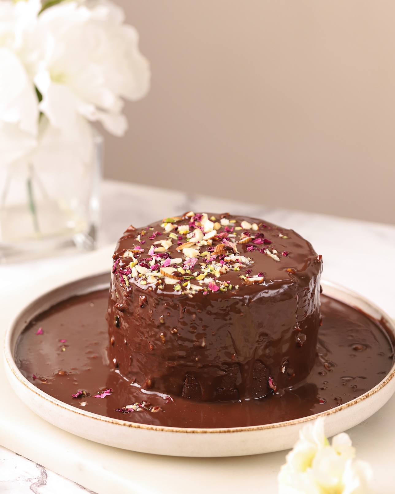 For Chocolate Cake - 3/4 cup (100g) - Powdered Jaggery or Raw Sugar 1/3 cup (25g) - Cocoa Powder 1/8 tsp Salt 1 cup (130g) - Wholewheat Flour 2 tbsp (20g) - Milk Powder 1.5 tbsp (10g) - Corn flour 1 tsp Baking Powder 1/2 tsp Baking Soda 1 cup (250ml) - Milk 1 tsp (5tsp) - Vinegar 1 tsp (5tsp) - Vanilla Extract 1/3 cup (80ml) - Butter/Ghee/Oil For Thick Ganache 150g Van Houten Professional Signature Dark Chocolate Callets 150g Whipping Cream For Thin Ganache 100g Van Houten Professional Signature Dark Chocolate Callets 90g Hot Milk 1 tbsp Chopped Nuts & Edible Rose Petals (optional) For the Cake - For Thick Ganache - For Thin Ganache - Assembly - Ensure the cake is completely cool before layering, otherwise the ganache will melt. Sift dry ingredients to avoid lumps in wholewheat batter. Do not overheat the cream while making ganache — it can split the chocolate. Use good quality chocolate for best flavour and shine. Chill the assembled cake for 20–30 minutes before serving for cleaner layers.