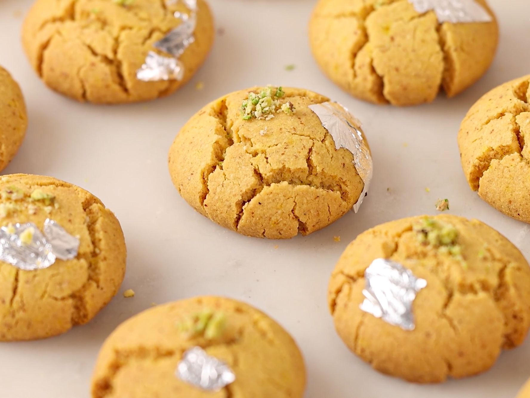 1 cup (110g) - Besan/Chickpea Flour 1/4 cup (30g) - Almonds 4 Cardamom pods 1/3 cup (70g) - Ghee/Unsalted Butter 1/2 cup (80g) - Raw Sugar 1/8 tsp Turmeric 1/8 tsp - White Salt or 1/4 tsp - Pink Salt 1/2 tsp - Baking Powder 1/4 tsp - Baking Soda Preheat the oven to 180 °C and line a baking tray with parchment paper. In a blender, grind besan, almonds, and cardamom into a fine powder. In a bowl, whisk ghee and powdered raw sugar until pale and fluffy — this step gives the cookies their light, crumbly texture. Add salt, turmeric, baking powder, and baking soda, and whisk again. Fold in the besan mixture to form a soft dough. Scoop about 1½ tablespoons of dough, roll into balls, and place on the tray. Bake for 15–20 minutes, or until large cracks appear on the surface. Cool completely on a wire rack. Garnish with chopped nuts and silver foil, and serve.