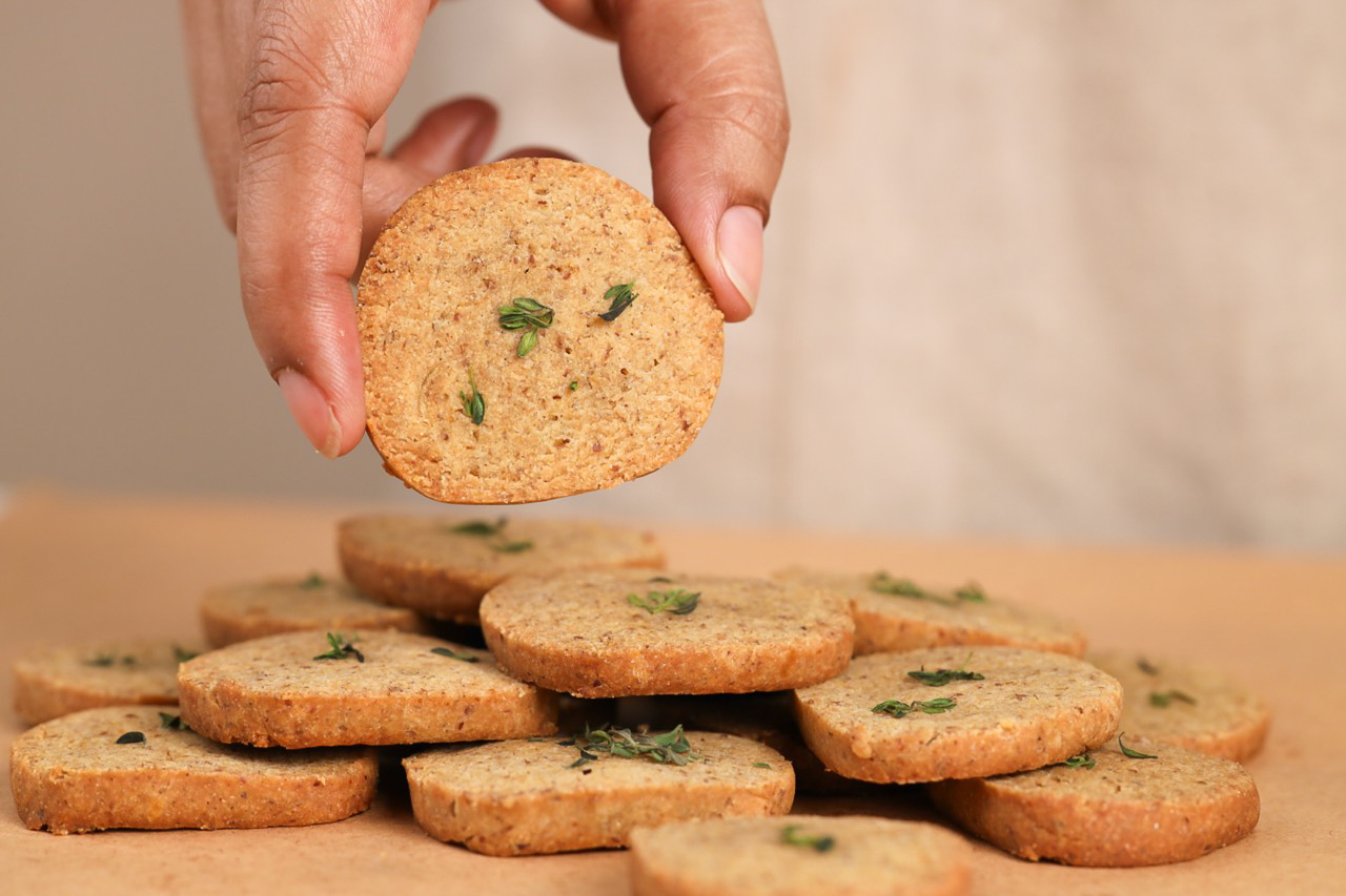 1 cup (120 g) - Jowar Flour 1/2 cup (90 g) - Crumbled Paneer 3 tbsp (40 g) - Butter/Ghee 1/2 -1 tbsp - Powdered Jaggery 1/4 - 1/2 tsp - Salt 1/4 tsp - Baking Powder 1 tbsp (6 g) - Ground Flaxseed 1 tbsp (15 ml) - Water In a mixing bowl, combine jowar flour, paneer, butter or ghee, jaggery, salt, and baking powder. Mix until crumbly and even. In a small bowl, mix flaxseed powder and water. Let it sit for 5 minutes until it forms a gel. Add the flax gel to the flour mix and knead into a dough. ing, add crushed spices like pepper, cumin, or ajwain for flavour. Shape the dough into a firm log. Wrap in plastic and refrigerate for 1 hour. Preheat oven to 180°C (350°F). Line a baking tray with parchment paper. Slice the chilled dough into 3-5 mm thick discs. Place on the tray. Dab each cookie with water and press a few thyme leaves on top (optional). Bake for 25–30 minutes until golden and firm to touch. Cool completely on a wire rack before storing in an airtight container.
