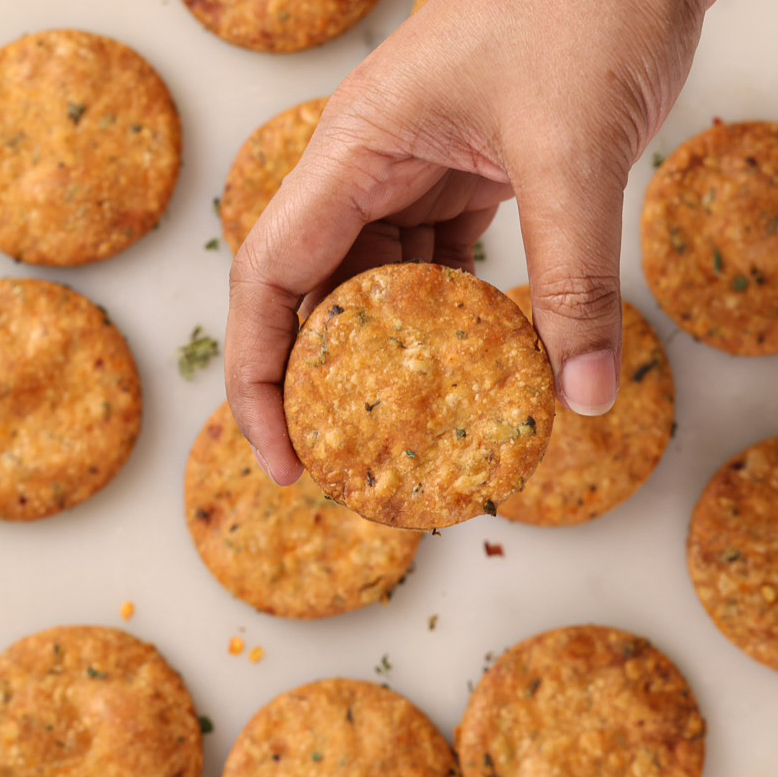 1.5 cup (200g) - Wholewheat Flour 1/2 tsp -3/4 tsp - Salt (Based on preference) 1-2 tbsp - Powdered Jaggery 1/2 tsp - Coriander Powder 1/2 tsp - Cumin Powder 1/2-1/4 tsp - Chilli Powder 1/2 tsp - Ajwain/Carom seeds 3 tbsp - Kasuri Methi 1/2 cup (100g) - Cold Butter 1/4 cup (60ml/60g) - Cold Water Pinch of Asafoetida/Hing In a mixing bowl, add wholewheat flour, salt, powdered jaggery, red chilli powder, carom seeds, coriander powder, cumin powder and dried fenugreek leaves. Add cold butter and rub it into the flour with your fingertips, pressing the butter and breaking it into smaller pieces. Stop when you have pockets of butter throughout the flour. Dissolve a pinch of asafoetida in cold water. Gradually add this water to bring the flour together into a firm dough. Do not over-knead the dough. Wrap the dough in plastic wrap and refrigerate for around 30 minutes to an hour. Roll the chilled dough between two sheets of parchment paper until evenly thin, around 2-3mm in thickness. Use a cookie cutter to cut out small circles. You can als cut them into squares or rectangles. Transfer onto a parchment-lined baking tray and bake in a preheated oven at 180°C for 15–20 minutes, or until crisp and golden. Let them cool completely on a wire rack before storing in an airtight jar for upto a month.